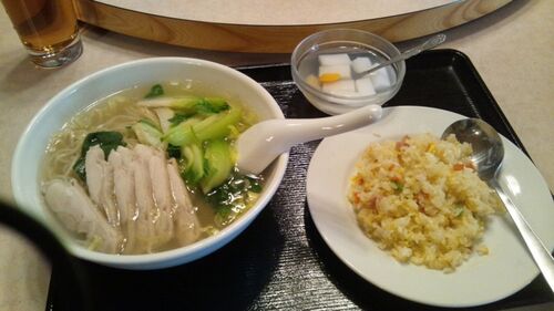 最後のexciteクーポン。 とり肉細切そばと半炒飯を頼んだ。 スープが前回のワンタンと同じ塩味。 ワンタンの方がワンタンの出汁が出て美味しい。チャーハンはミックスベジタブルと卵とチャーシュー。 可もなく不可もなし。