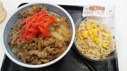 吉野家で牛丼並300円と生野菜サラダ100円を食べた。 クーポン50円引きを使って350円。